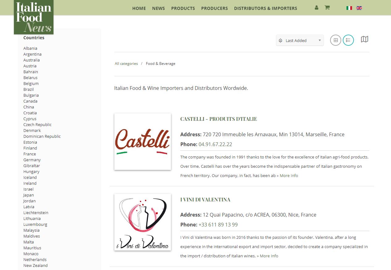La directory degli importatori e distributori è consultabile in doppia lingua, in modo da dare la possibilità alle aziende presenti di avere un proprio profilo, con informazioni chiare e sintetiche. Lo strumento della "ricerca importatori" (sicuramente di interesse da parte dei produttori italiani) è complementare al marketplace, dove i produttori espongono il loro catalogo prodotti e ricevono richieste di preventivo e ordini online.