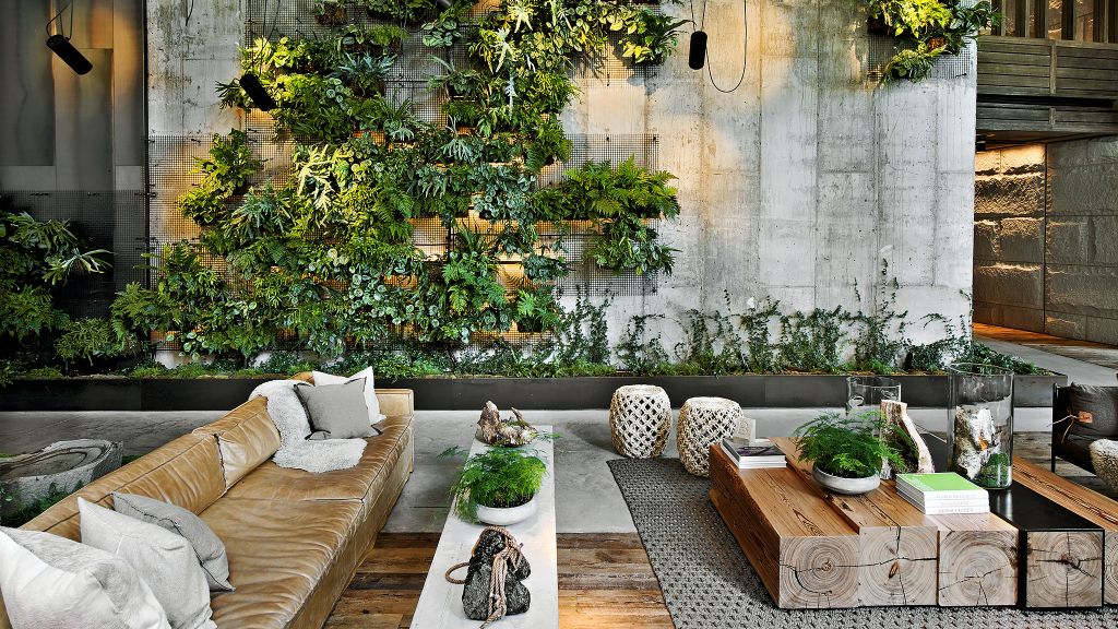 La lobby del 1 Hotel Brooklyn Bridge di New York unisce materiali naturali e design contemporaneo in un equilibrio studiato. Le pareti verticali ricoperte di vegetazione creano un fondale vivo che dialoga con la superficie grezza del cemento, mentre i grandi blocchi di legno riciclato utilizzati come tavoli trasmettono solidità e autenticità.