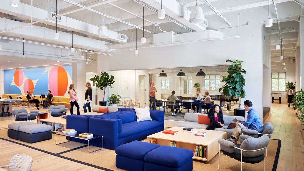 Gli spazi comuni dell'Hotel Zoku di Amsterdam è concepita come un grande spazio condiviso, dove coworking e socialità convivono senza barriere rigide. Arredi colorati e modulari creano zone distinte ma comunicanti. Dal divano angolare alle sedute più informali, ogni elemento è pensato per incoraggiare la flessibilità e l'interazione.