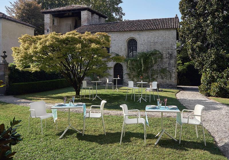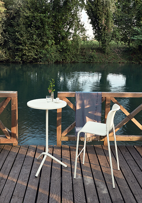 Pensata e disegnata per il settore della ristorazione dal designer svizzero Christoph Jenni è la gamma Vesper, composta da sedie, poltroncine e sgabelli, in polipropilene caricato vetro con struttura in metallo. Impilabili, sono adatte sia a spazi interni, nella versione con base cromata, che ad esterni nella versione su base verniciata.