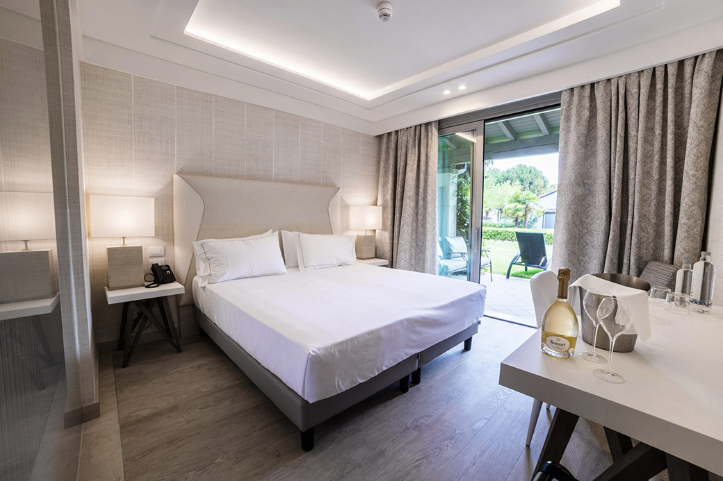 All'esterno il Beach Bar, una struttura circolare, aperta e autoportante, progettata intorno a un grosso cedro al fine di integrarsi nel paesaggio e nella prospettiva visiva del lago. Ad arricchire tale area verde, arredi dal fascino senza tempo e dal design moderno, come i lounge bed e le luci dalle linee geometriche e raffinate.