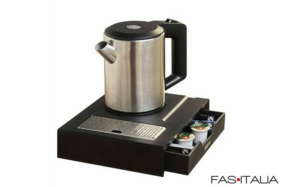 Allo stesso modo, il vassoio con cassetto e bollitore si distingue per il formato compatto e la cura dei dettagli. Oltre all'alloggiamento per il bollitore, il vassoio è progettato per garantire ordine e praticità. Infatti dispone di una sottile canalina per il cucchiaino, di una griglia per appoggiare le tazze con sistema di raccolta delle eventuali gocce e di un ampio cassetto sottostante, ideale per riporre bustine di zucchero, tè o caffè. Una soluzione elegante e funzionale che aggiunge un gesto di accoglienza semplice ma molto apprezzato dagli ospiti.