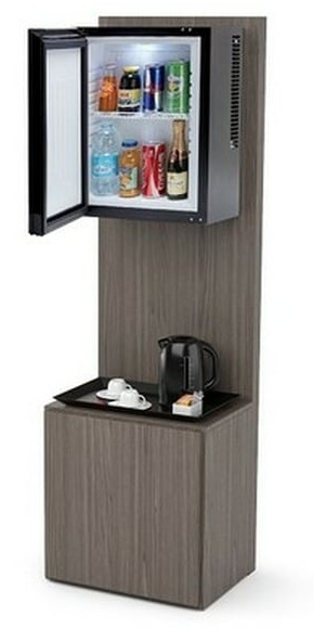 Tra le proposte più interessanti figurano le colonne attrezzate per frigobar e cassaforte, che riuniscono in un unico modulo compatto più funzioni utili all'ospite, e le colonne a parete per frigobar, ideali per sfruttare le superfici verticali e mantenere libero il pavimento.