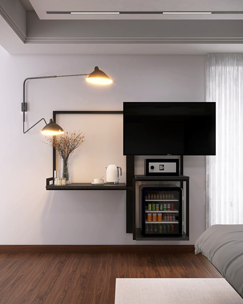 In una camera d'hotel, ogni elemento deve contribuire a rendere l'ambiente ordinato e gradevole. Le soluzioni d'arredo integrate rispondono proprio a questa esigenza, offrendo praticità e coerenza estetica in uno spazio ridotto.