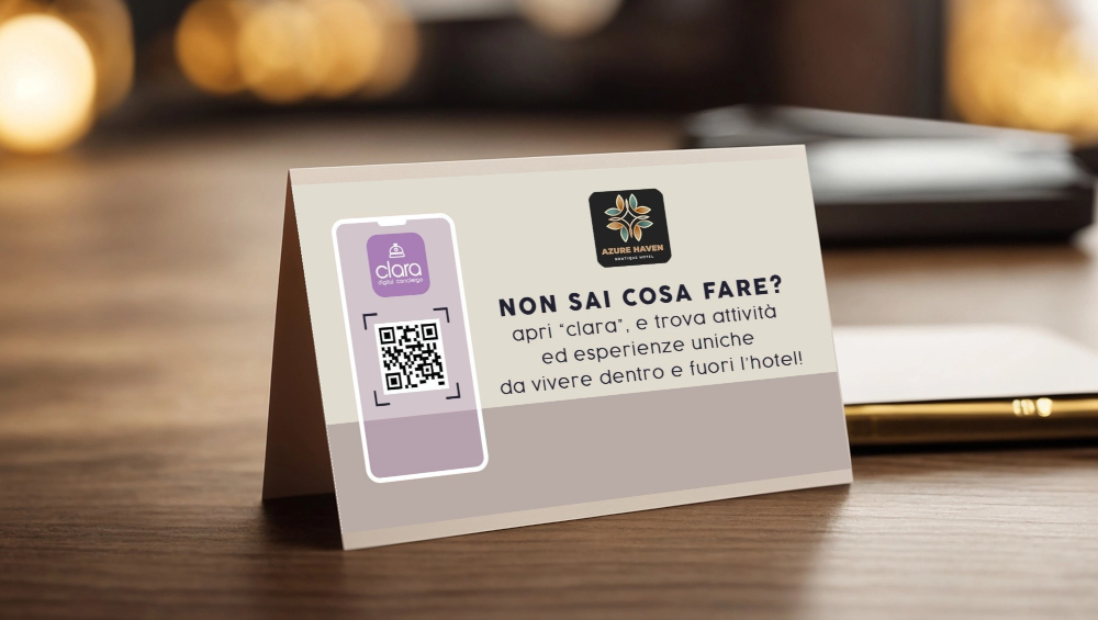 Clara è una web app pensata per dare risposte rapide e accurate alle domande più frequenti degli ospiti e per raccogliere, in un unico spazio, le informazioni utili sui servizi disponibili in hotel e sulle proposte del territorio. La piattaforma può supportare anche la fase operativa del soggiorno, accompagnando l'ospite nella prenotazione o nell'acquisto di esperienze e servizi extra.