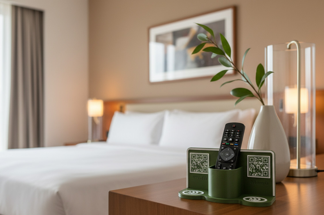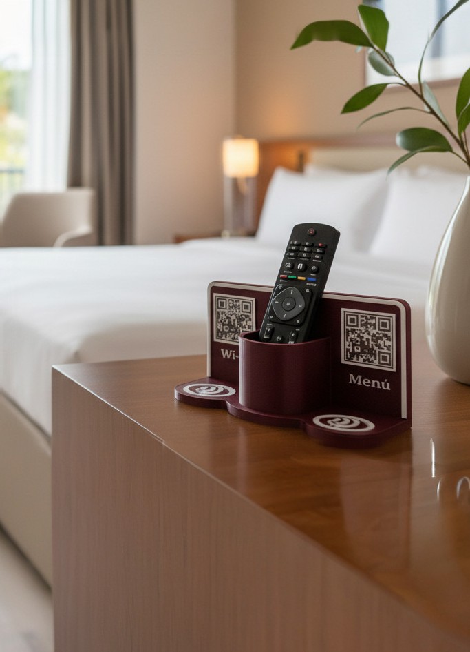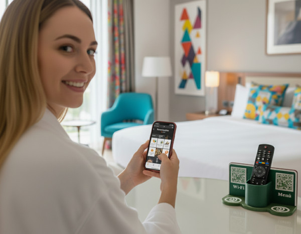 La room directory è uno degli strumenti più semplici e funzionali presenti in camera, pensata per fornire agli ospiti informazioni immediate sui servizi della struttura. Nella sua versione digitale diventa ancora più efficace: basta inquadrare i QR code o avvicinare lo smartphone (grazie ai tag RFID) per accedere istantaneamente a orari, menu, Wi-Fi, canali TV, servizi extra, SPA e molto altro, senza ricorrere a materiali cartacei. Compatta, intuitiva e personalizzabile nei colori e con il logo della struttura, rappresenta una soluzione moderna che migliora la comunicazione interna, riduce gli sprechi e rende l'esperienza in camera più ordinata e contemporanea.