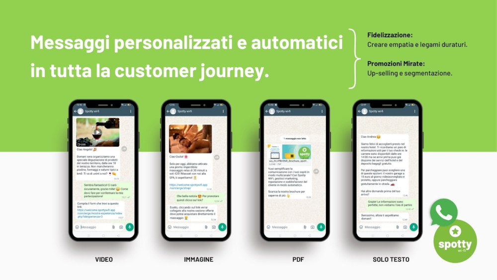 Per sfruttare appieno le potenzialità di WhatsApp, non basta il semplice invio di messaggi, ma è necessario affidarsi ad una piattaforma che consenta di raccogliere i dati in modo conforme alla normativa, automatizzare i flussi e trasformare la comunicazione in uno strumento di marketing misurabile. In questa direzione si inserisce Spotty Wi-Fi, la soluzione digitale che integra il modulo WhatsApp con il sistema di accesso alla rete, rendendo più immediata per l'albergatore la gestione dei contatti e delle campagne.