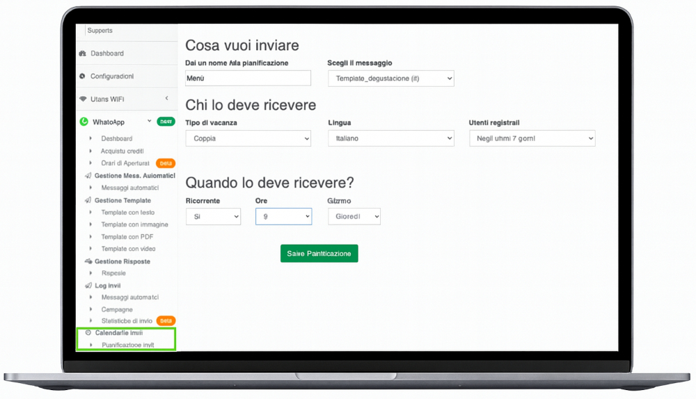 Il modulo WhatsApp di Spotty Wi-Fi offre strumenti avanzati di pianificazione e segmentazione. Con la sezione "Calendario invii", cliccando su "Pianificazione invii", è possibile programmare messaggi in date precise, definire i segmenti di ospiti in base agli interessi o al periodo di soggiorno e utilizzare template ricorrenti che si ripetono automaticamente senza bisogno di riprogrammare ogni volta la stessa campagna.